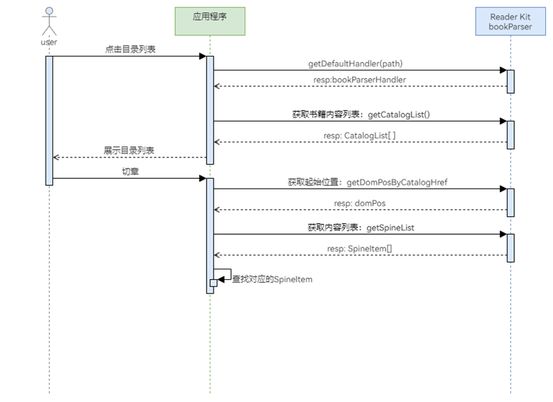 private jumpToCatalogItem(catalogItem: bookParser.CatalogItem) {let domPos = this.getDomPos(catalogItem);let resourceIndex = this.getResourceItemByCatalog(catalogItem).index;// 通过domPos及resourceIndex信息,即可通过startPlay接口跳转到指定位置hilog.info(0x0000, "testTAG", `jumpToCatalogItem domPos:${domPos}, resourceIndex:${resourceIndex}`);}private getDomPos(catalogItem: bookParser.CatalogItem): string {try {let domPos: string = this.defaultHandler?.getDomPosByCatalogHref(catalogItem.href || '') || '';return domPos;} catch (error) {hilog.error(0x0000, "testTAG", `getDomPos failed, Code: ${error.code}, message: ${error.message}`);}return '';}/*** 获取书籍目录对应的资源条目** @param catalogItem 目录条目*/private getResourceItemByCatalog(catalogItem: bookParser.CatalogItem): bookParser.SpineItem {let resourceFile = catalogItem.resourceFile || '';try {let spineList: bookParser.SpineItem[] = this.defaultHandler?.getSpineList() || []// 查找目录对应的资源条目let resourceItemArr = spineList.filter(item => item.href === resourceFile);if (resourceItemArr.length > 0) {hilog.info(0x0000, 'testTag', 'getResourceItemByCatalog get resource ', resourceItemArr[0]);let resourceItem = resourceItemArr[0];return resourceItem;} else if (spineList.length > 0) {// 如果查找不到,则默认返回第1个资源条目hilog.info(0x0000, 'testTag', 'getResourceItemByCatalog get resource in resourceList', spineList[0]);return spineList[0];}} catch (error) {hilog.error(0x0000, "testTAG", `getDomPos failed, Code: ${error.code}, message: ${error.message}`);}// 如果没有资源条目,则返回默认值hilog.info(0x0000, 'testTag', 'getResourceItemByCatalog get resource in escape');return {idRef: '',index: 0,href: '',properties: ''};}