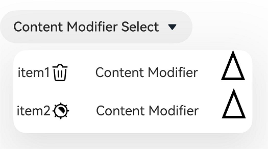 | modifier | ContentModifier | 是 | 在Select组件上,定制下拉菜单项内容区的方法。 modifier:内容修改器,开发者需要自定义class实现ContentModifier接口。 |