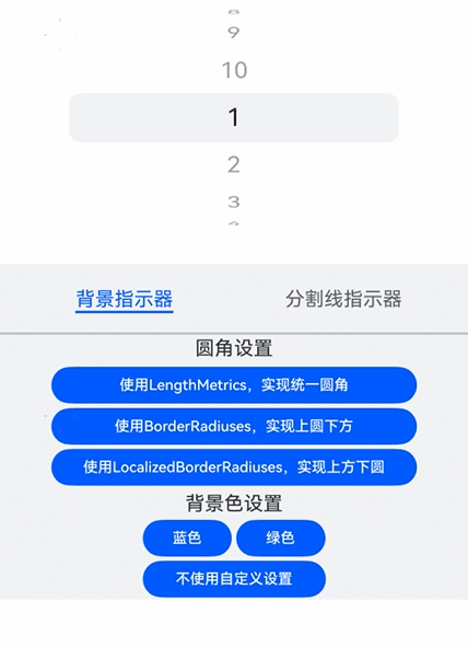 | type | PickerIndicatorType | 否 | 否 | 选中项指示器的类型。 默认值:PickerIndicatorType.BACKGROUND 当type的值为小数时,使用向下取整后的整数;当type的值不在PickerIndicatorType枚举范围内时,使用默认值。 |