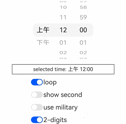 - 当UIPickerComponent容器未设置width时,取当前视图中可见子组件的最大宽度作为容器宽度。建议为UIPickerComponent容器设置宽度,或为每个子组件设置相同宽度,以避免滑动过程中容器宽度动态发生变化,影响显示效果。