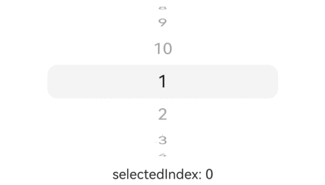- UIPickerComponent容器的选项行高固定为40vp,最多可显示7个选项。由于显示效果为立体滚轮样式,因此除选中项外的其他选项会进行不同角度的旋转,实际的可视高度会小于40vp。