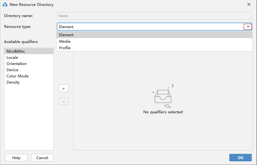 | base目录 | base目录默认存在。二级子目录element用于存放字符串、颜色、布尔值等基础元素,media和profile子目录存放媒体、动画、布局等资源文件。 目录中的资源文件会被编译成二进制文件,并分配资源ID。通过指定资源类型(type)和资源名称(name)来访问。 |