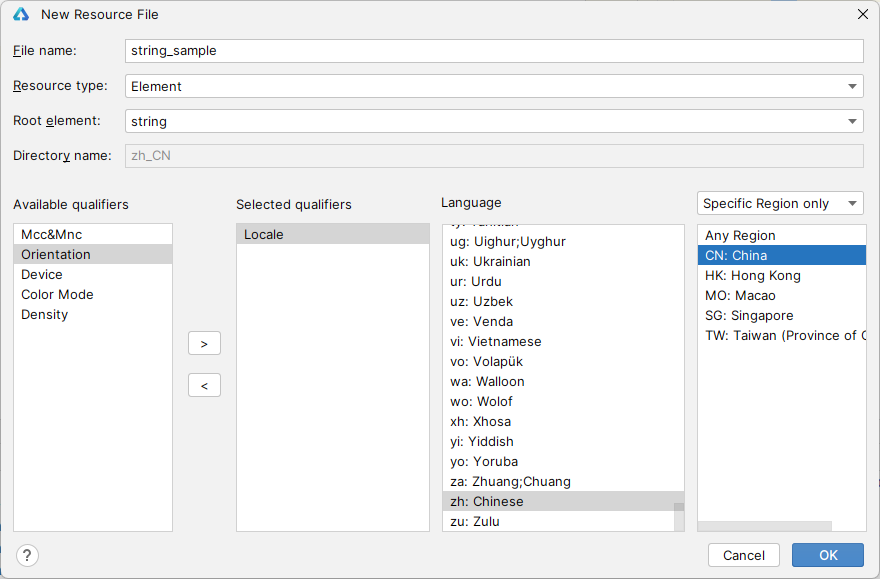 - 限定词的连接方式:移动国家码和移动网络码之间采用下划线(_)连接,语言、文字、国家或地区之间也采用下划线(_)连接,除此之外的其他限定词之间均采用中划线(-)连接。例如:mcc460_mnc00-zh_Hant_CN、zh_CN-car-ldpi。