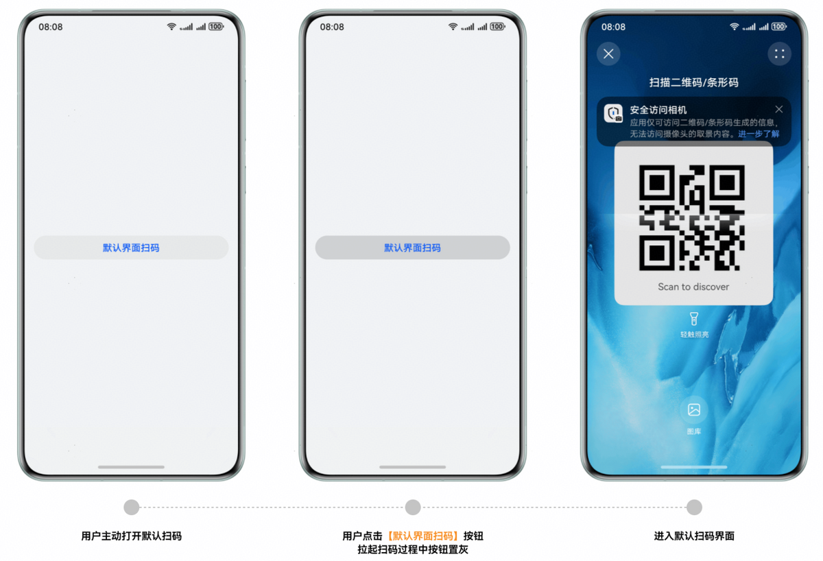媒体Scan Kit(统一扫码服务)Scan Kit常见问题默认界面扫码/自定义界面扫码体验设计默认界面扫码/自定义界面扫码体验设计 问题现象 点击按钮后,无法确认是否正在拉起扫码功能。 解决措施 点击按钮拉起默认界面扫码或自定义界面扫码后,将按钮置灰,说明正在拉起扫码功能,以“默认界面扫码”按钮为例: