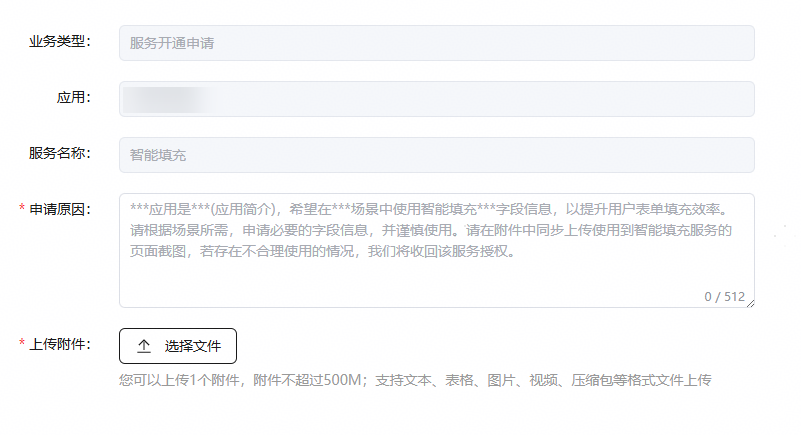 - 申请原因:请详细描述使用智能填充的具体场景。(例如:***应用是***(应用简介),希望在***场景中使用智能填充***字段信息,以提升用户表单填写效率。)字段信息请参考ContentType使用场景说明。