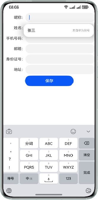 智能填充服务提供场景化的输入建议,完善应用/元服务的系统开发能力,实现用户对复杂表单的一键填充,助力打造HarmonyOS极致输入效率。开发ArkUI输入组件后(TextInput、TextArea以下统称输入组件),一行代码配置快速启用功能。