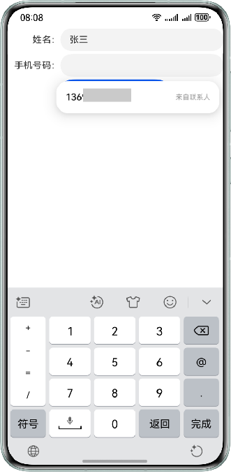 点击配置了ContentType为“PHONE_NUMBER”(手机号)的输入组件时,若表单中存在ContentType为“PERSON_FULL_NAME”(姓名)或“PERSON_LAST_NAME”(姓氏)、“PERSON_FIRST_NAME”(名字)的输入组件且已填入信息,将根据其填入的信息来推荐联系人数据。