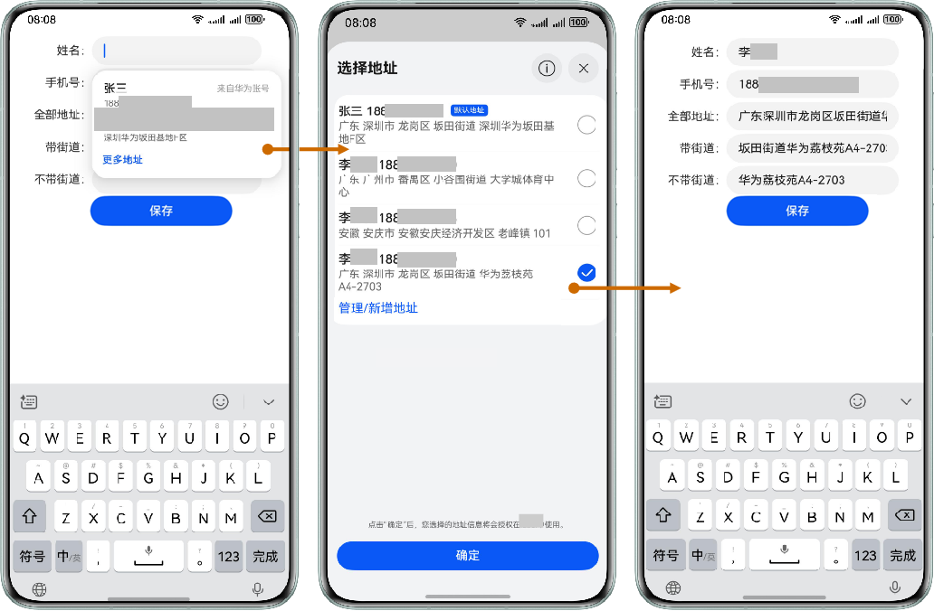 - 表单中存在ContentType为“PERSON_FULL_NAME”(姓名)或“PERSON_LAST_NAME”(姓氏)、“PERSON_FIRST_NAME”(名字)的输入组件且存在地址输入组件,在点击用户姓名类和地址信息类的ContentType输入组件时,若推荐的数据包含华为账号数据源的数据,且华为账号数据源的推荐数目少于推荐的华为账号收货地址数据时,可点击“更多地址”按钮拉起选择其他收货地址页面。