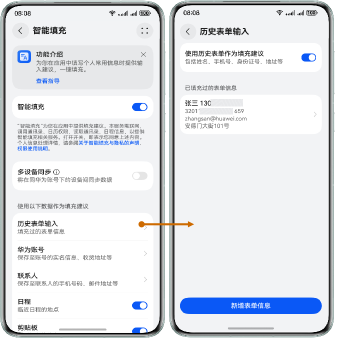 在智能填充页面或个人信息页面可以对历史表单输入进行管理。当历史表单输入中无数据,可点击“新增表单信息”进行新增;也可对已保存的信息进行修改或删除(当设备设置锁屏密码,进入历史表单输入时,需要输入锁屏密码)。