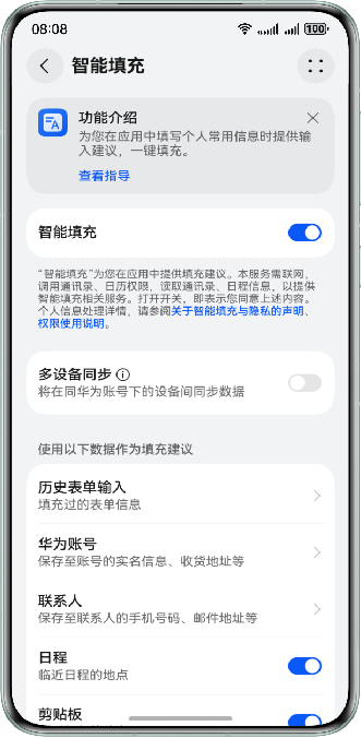 - 设备智能填充开关必须处于打开状态,请前往“设置 > 隐私和安全 > 智能填充”页面开启开关,页面中可查看“关于智能填充与隐私的声明”和“权限使用说明”。