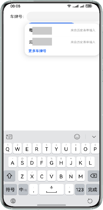 当表单中需要车牌号填写时,可从历史表单输入数据源中获取机主本人的车牌信息。