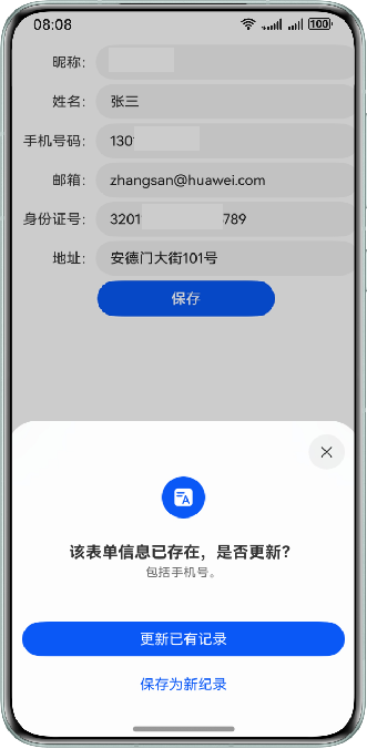 当表单中存在ContentType为“PERSON_FULL_NAME”(姓名)的输入组件时,且表单还存在其他任一配置了ContentType的输入组件,在触发保存时若历史表单输入记录中存在该姓名的记录且其他数据存在差异,则拉起页面提示“更新已有记录”或“保存为新记录”。
