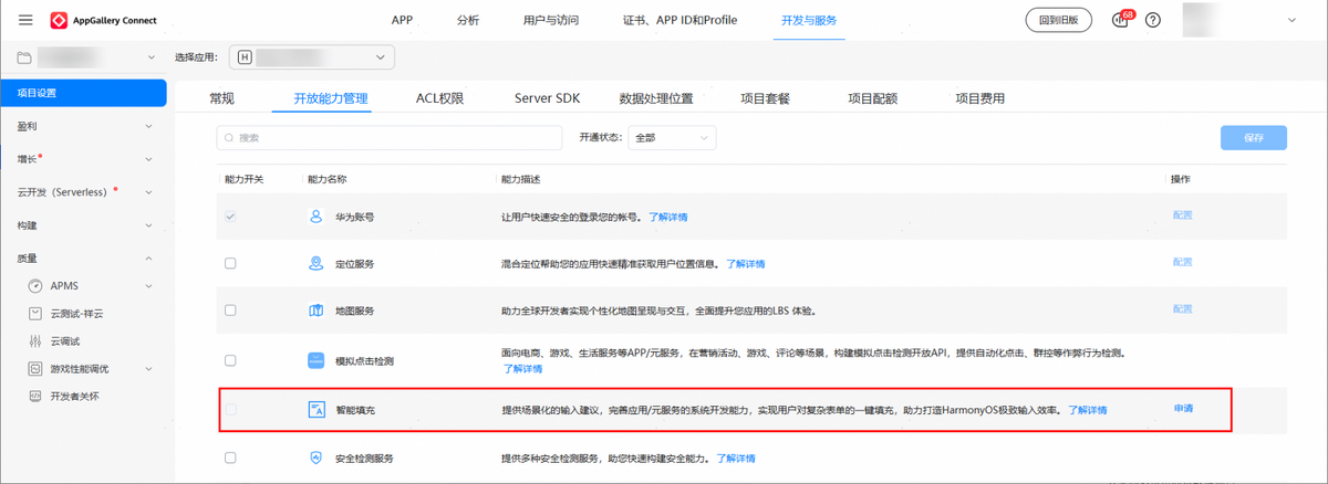 选择应用后,在“开放能力管理”栏,找到智能填充服务的开放能力,点击右侧“申请”。