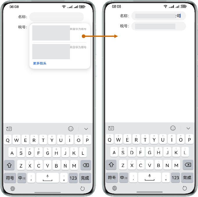当表单中存在ContentType为“ORGANIZATION”(名称)和“TAX_ID”(税号)时,点击名称框可从华为账号数据源获取数据进行主动推荐,或根据输入内容进行匹配推荐,名称单框不支持推荐;税号框则根据名称框内容进行匹配推荐,名称框为空则进行主动推荐,税号单框不支持匹配推荐。