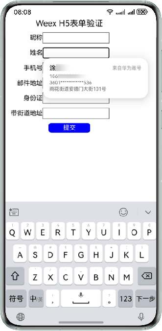 在Weex的form表单中给input输入框(form表单的子节点)配置autocomplete属性以实现智能填充,代码中action需要配置表单提交接口链接,当form表单提交后,页面导航发生变化时,满足历史表单输入保存的条件时会触发对应弹窗。代码如下: