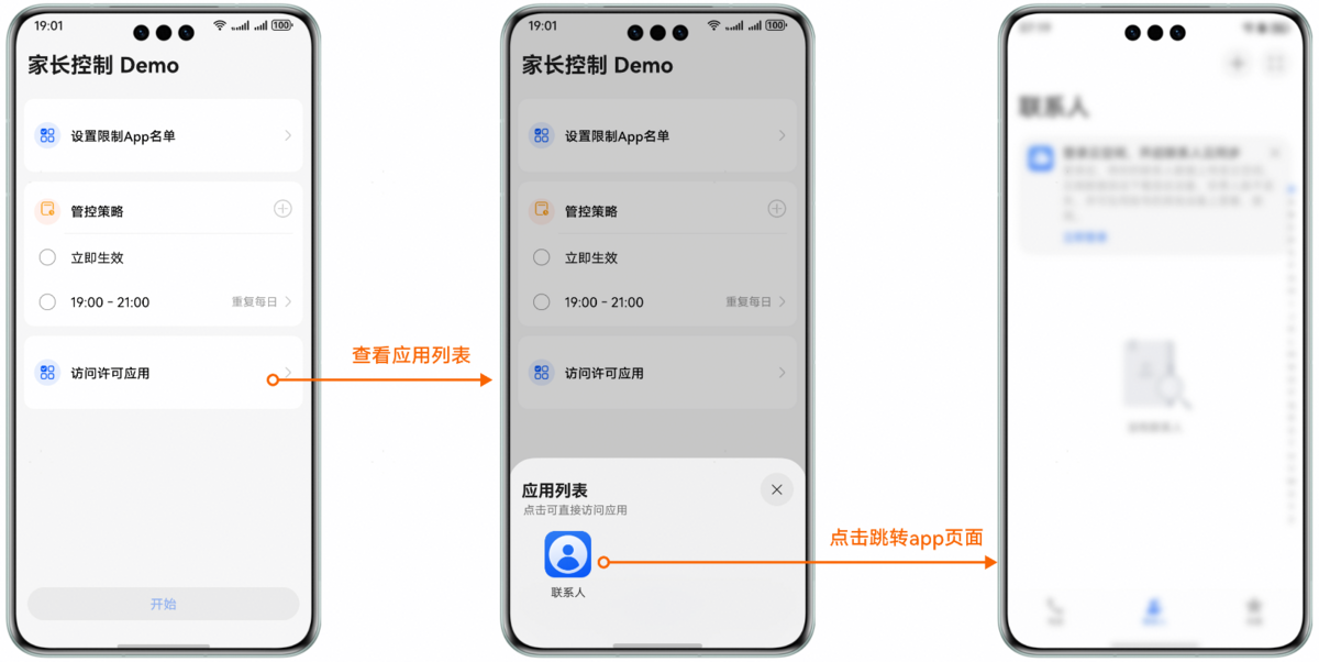 从6.0.2(22)版本开始,新增支持拉起许可应用跳转页功能。为实现用户在被管控期间快速跳转到许可应用的诉求,开发者可调用startAppForm接口拉起应用跳转页,页面中将展示通过接口参数传入的许可应用token对应的应用列表。用户点击其中的应用图标后能跳转到该应用。