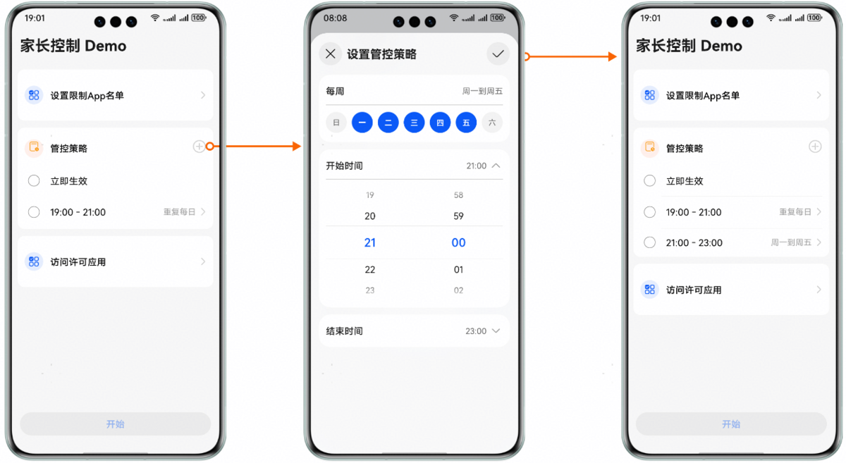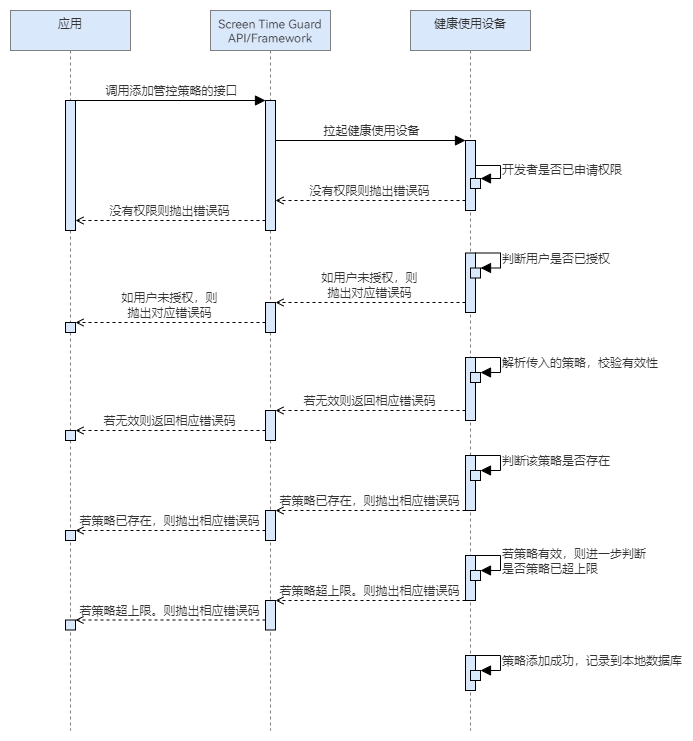当用户希望创建新的屏幕时间守护规则时,可以调用添加管控策略的接口。根据参数中传入的策略,用户可以添加各种策略,如设置各个应用的停用起止时间。一旦策略被创建并启用,系统将根据规则对用户的屏幕使用行为进行监管。