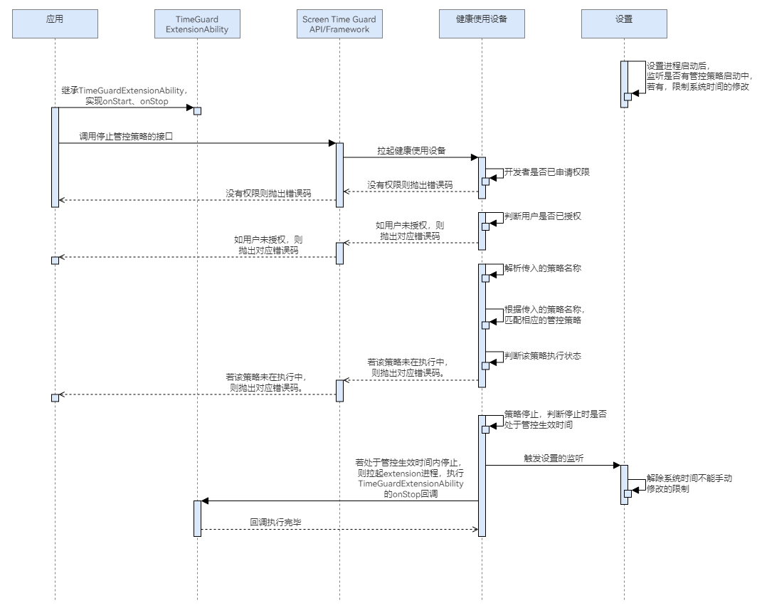 - 策略生效期间停止策略,会拉起extension进程,执行TimeGuardExtensionAbility的onStop回调。在非策略生效期间停止策略,不会触发onStop回调。