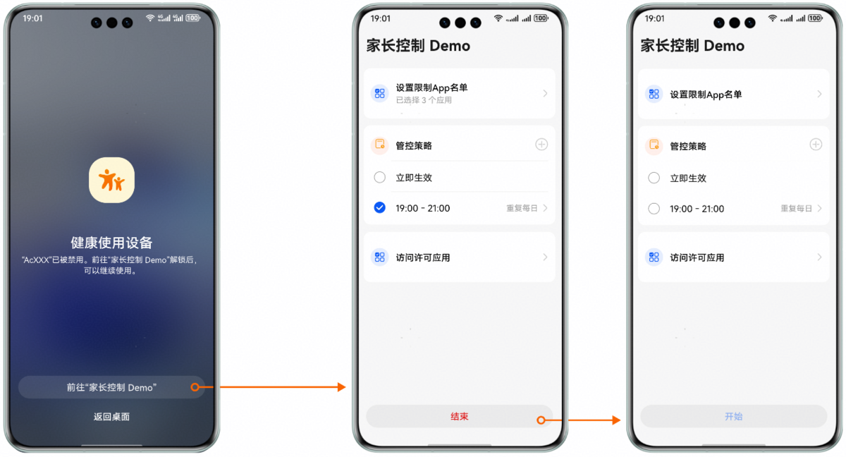 - 应用调用停止管控策略的接口,会拉起健康使用设备查询本应用是否已申请权限、用户是否已给本应用授权。
