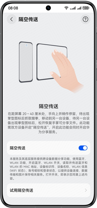 隔空传送与隔空截屏使用相同的手势触发,开关是否开启影响如下: