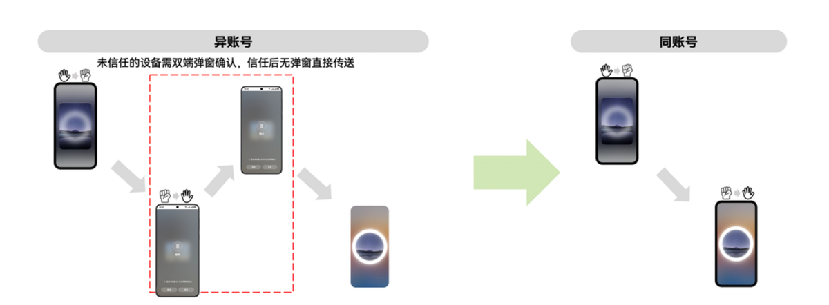 应用服务Share Kit(分享服务)隔空传送可信任设备间传输可信任设备间传输 若双端已登录相同的华为账号,则默认设备可信,无需确认即可传输。 若双端未登录相同的华为账号,需询问用户是否信任对端设备。双端同时信任后,1小时内再次传输无需确认。