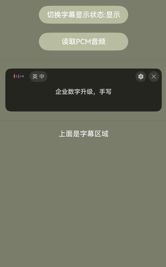 import { AudioData } from '@kit.SpeechKit';@Entry@Componentstruct Index {isReading: boolean = false;async readPcmAudio() {this.isReading = true;let fileData: Uint8Array | undefined = undefined;try {fileData =await this.getUIContext()?.getHostContext()?.resourceManager.getMediaContent($r('app.media.chineseAudio').id);} catch (e) {Logger.info(`get fileData fail , msg ${e} `)}if (fileData === undefined) {return;}const bufferSize = 640;const byteLength = fileData.byteLength;let offset = 0;Logger.info('byteLength', byteLength.toString())let startTime = new Date().getTime();while (offset < byteLength) {// 模拟实际情况,读文件比录音机返回流快,所以要等待一段时间let nextOffset = offset + bufferSizeif (offset > byteLength) {this.isReading = false;return}const arrayBuffer = fileData.buffer.slice(offset, nextOffset);let data = new Uint8Array(arrayBuffer);Logger.info('data byteLength', data.byteLength.toString())const audioData: AudioData = {data: data}Logger.info(`offset: ${offset} | byteLength: ${byteLength} | bufferSize: ${bufferSize}`)if (this.controller) {Logger.info(`writeAudio: ${audioData.data.byteLength}`)try {this.controller.writeAudio(audioData)} catch (e) {Logger.error(`writeAudio exception`)}}offset = offset + bufferSize;const waitTime = bufferSize / 32await this.sleep(waitTime)}let endTime = new Date().getTime()this.isReading = false;Logger.info('playtime', JSON.stringify(endTime - startTime))}async sleep(time: number): Promise<void> {return new Promise(resolve => setTimeout(resolve, time))}build() {Column({ space: 20 }) {// ...Button('切换字幕显示状态:' + (this.isShown ? '显示' : '隐藏')).backgroundColor('#B8BDA0').width(200).onClick(() => {this.isShown = !this.isShown;})Button('读取PCM音频').backgroundColor('#B8BDA0').width(200).onClick(() => {if (!this.isReading) {void this.readPcmAudio()}})// ...}}}