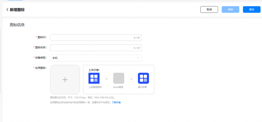 输入图标ID、图标名称,选择设备类型,上传图标文件,点击“保存”或者“提交”按钮,将图标保存为草稿状态或提交审核。