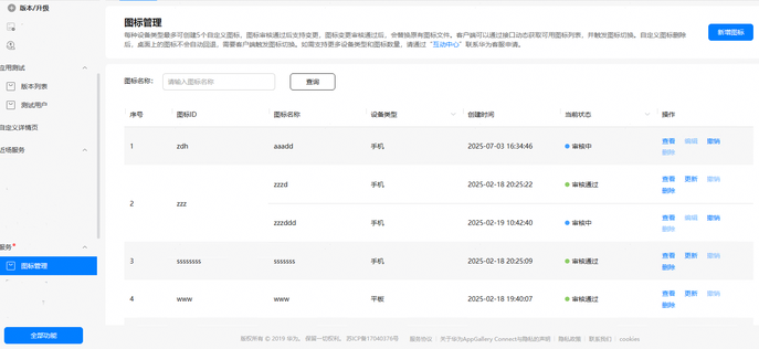 - 请确保申请开通图标管理服务的应用处于正式上架状态,避免服务开通失败。