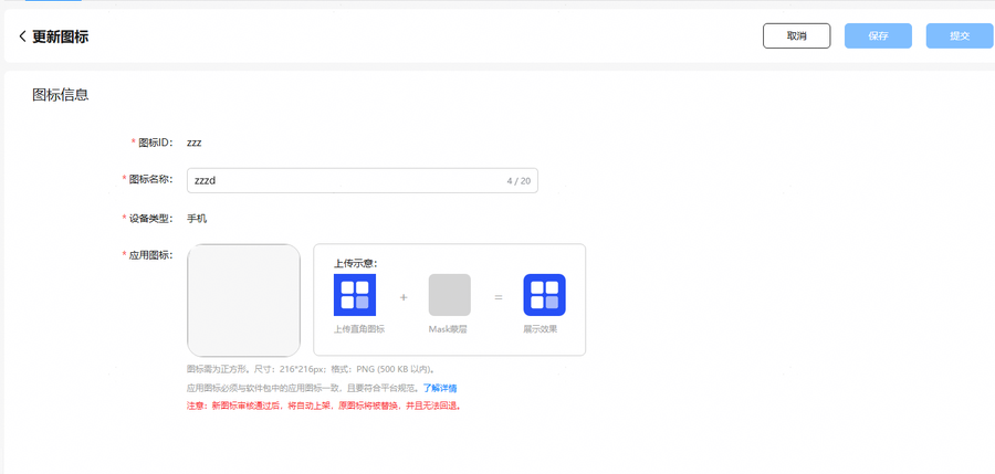 - 图标审核时间为1-3个工作日,审核状态和审核意见直接展示在图标信息查看页面,不会单独通知。