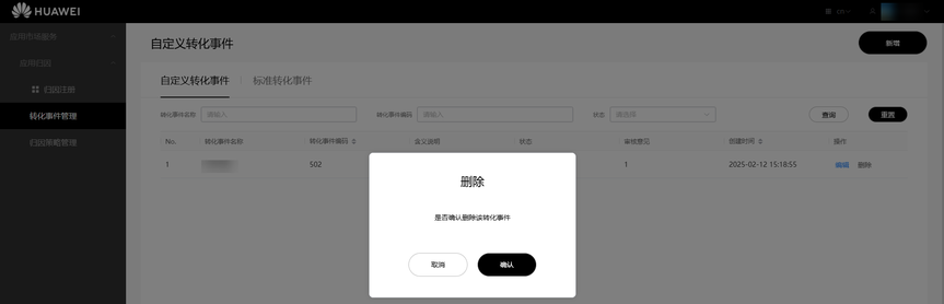 状态为“生效”的自定义转化事件,点击“确认”后该条自定义转化事件的状态由“生效”变为“删除待审核”。