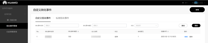 点击左侧转化事件管理菜单栏,进入自定义转化事件页面查看自定义转化事件信息。