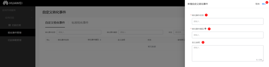填写“转化事件名称”、“转化事件编码”、“含义说明”信息,点击“确认”按钮后会生成一条状态是“新建待审核”的自定义转化事件。