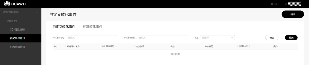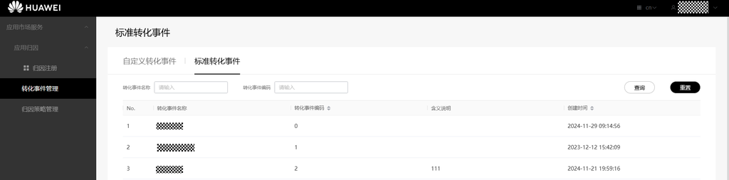 应用服务AppGallery Kit(应用市场服务)应用归因服务开发准备管理转化事件标准转化事件标准转化事件 接入应用归因服务前,请先明确转化事件。应用归因支持标准转化事件和自定义转化事件,建议开发者优先选用标准转化事件登记上报。若无法满足业务需求,开发者可自行创建自定义转化事件用于后续的归因服务。 处于生效状态的开发者角色的合作伙伴在转化事件管理页面可以查看标准转化事件和自定义转化事件: 点击左侧“转化事件管理”菜单,点击页面中“标准转化事件”。 查看标准转化事件信息。 生效状态的监测平台角色只展示标准转化事件列表。