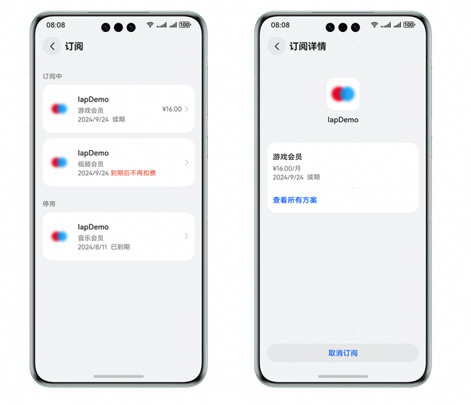 取消订阅:对已购自动续期订阅商品进行取消操作。取消成功,则订阅将不会进行下一周期的续费,但不影响当期订阅的使用。