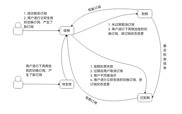 用户在成功购买自动续期订阅商品后,订阅会变为续期状态。当发生如下操作时,订阅的状态会随之改变: