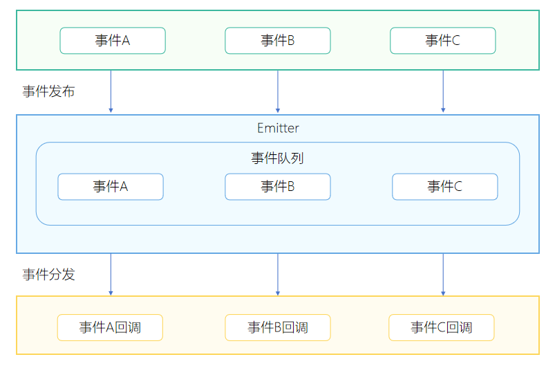 Emitter通过维护一个内部事件队列,来进行任务分发。应用需要先订阅某个事件并设置好该事件的回调方法,当应用程序发布事件后,就会往队列里面插入一个事件。任务队列会串行执行队列里面的任务,执行任务时会调用该任务订阅者的回调方法进行事件处理。