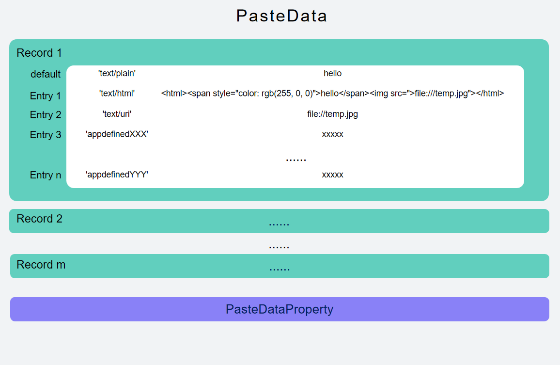 - 剪贴板数据定义对应PasteData,复制应用通过向剪贴板服务写入PasteData实现数据复制,粘贴应用通过读取剪贴板服务的PasteData实现数据粘贴,PasteData整体结构示意如下: