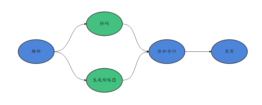 - 多级任务链,例如:流媒体视频处理过程中,视频解析后可以进行视频转码和视频生成缩略图,然后是视频添加水印,最后是视频发布。