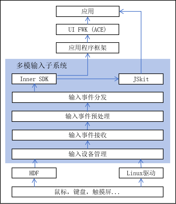 系统基础功能Input Kit(多模输入服务)Input Kit简介本页总览Input Kit简介 功能介绍 Input Kit(多模输入Kit)为多种输入设备提供服务,如触控板、触摸屏、鼠标、键盘等。通过对这些输入设备上报驱动事件的归一化处理,确保不同输入设备与用户交互体验统一和流畅。 Input Kit除了提供基础的输入事件服务之外,还提供了获取输入设备列表、改变鼠标光标样式等功能和接口。 运作机制 多模输入能力作为系统为应用提供的一种基础服务,通过处理上报的输入设备驱动事件,完成输入事件管理、接收、预处理、分发,通过inner SDK与JSkit上报应用,具体运行机制如下。