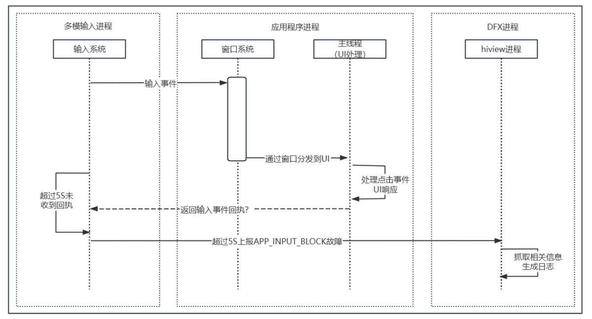 检测原理:用户点击应用时,输入系统会向应用侧发送点击事件;应用侧的响应反馈回执超时,则上报该故障。