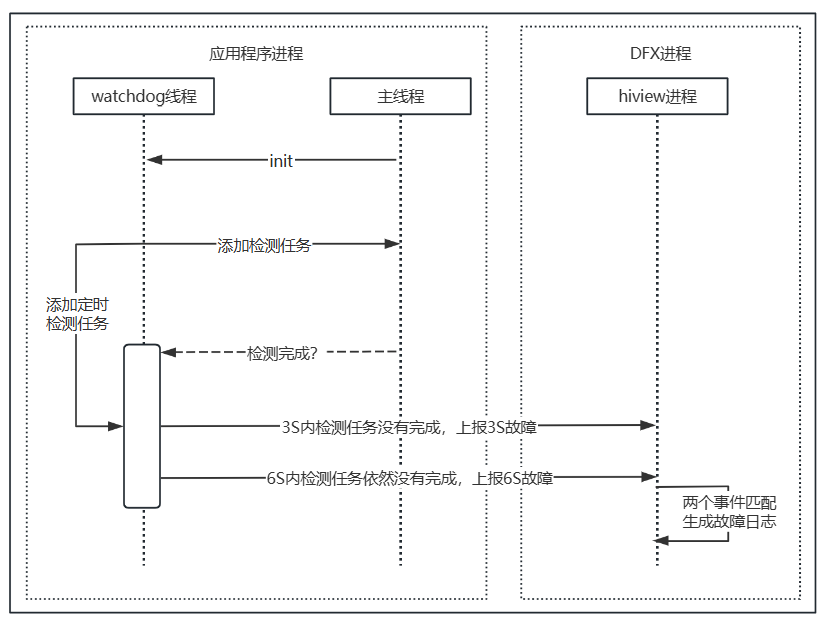 检测原理:应用的watchdog线程定期向主线程插入判活检测任务。如果判活检测超过3s未被执行,将上报THREAD_BLOCK_3S告警事件;如果超过6s仍未被执行,将上报THREAD_BLOCK_6S主线程卡死事件。两个事件匹配生成THREAD_BLOCK的应用无响应日志。