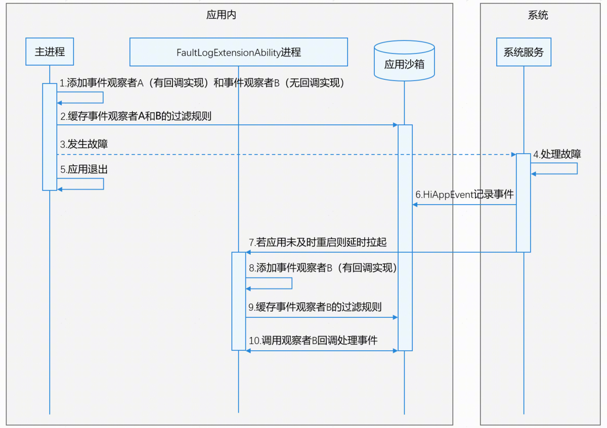 - 在FaultLogExtensionAbility进程中的订阅是应用安装后的首次订阅。HiAppEvent不感知在订阅操作前发生的事件,需要主进程中正常订阅相关事件,发生故障后HiAppEvent才会记录相关事件,在拉起FaultLogExtensionAbility后进行回调。