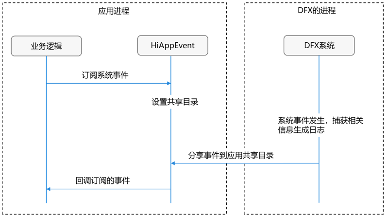 应用调用HiAppEvent的addWatcher接口订阅系统事件并创建共享目录。当应用进程发生故障时,DFX系统捕获相关信息,生成事件和日志,并写入到共享目录。HiAppEvent监听到事件后,将事件回调给应用。