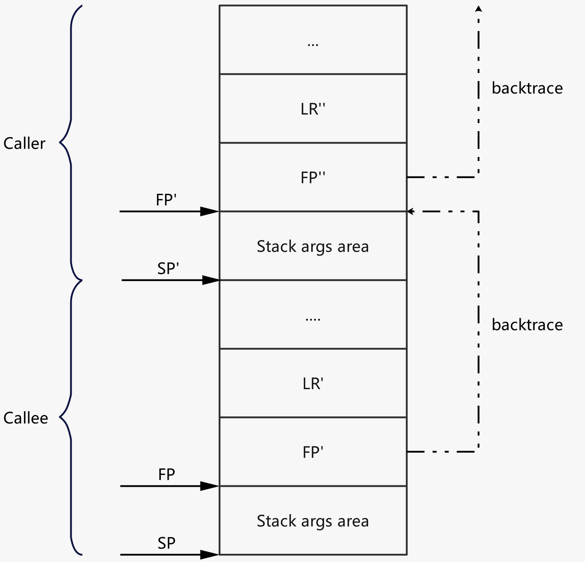 如图,与FP相邻的地址分别保存了上一帧的FP地址和当前帧的函数返回地址。进行栈回溯时,通过函数返回地址解析上一帧的栈信息,并根据上一帧的FP地址,依次找出每个函数栈帧中存储的LR和FP地址。基于FP回栈的特性,在当前调用函数中只能获取当前函数的返回地址进行栈解析,因此无法获取当前函数的调用栈信息。