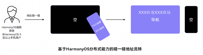 碰一碰地址流转:用户在手机地址文本页面与车机中控屏指定区域碰一碰后,将手机上的地址数据流转至车机的地图应用,发起地址搜索。