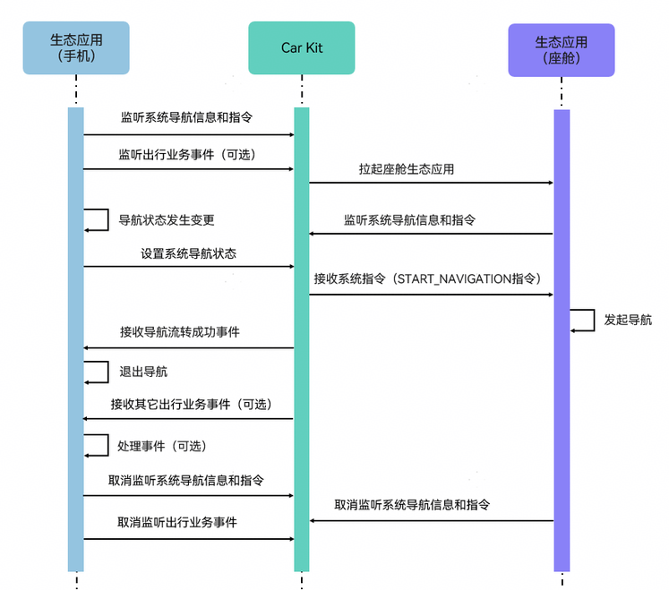 地图应用在监听系统导航信息和指令的同时,还可以注册智慧出行业务的事件监听,方便地图应用接收智慧出行业务发送的事件通知(如:流转成功事件),用于对应的业务逻辑处理。