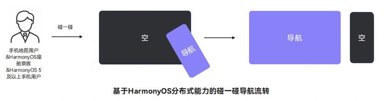 碰一碰导航流转:用户在手机地图的指定页面中(地图选点页面、规划路线页面、驾车导航页面),与车机中控屏指定区域碰一碰后,将手机上的导航数据流转至车机。