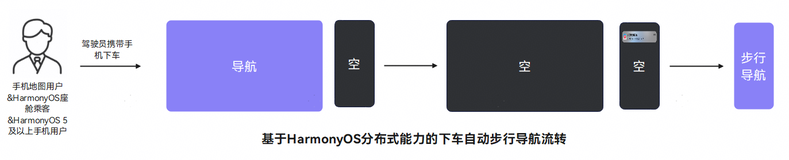 下车步行导航流转:用户下车前,车机地图应用导航还未结束,下车后可将车机上的导航数据流转至手机,发起步行导航。