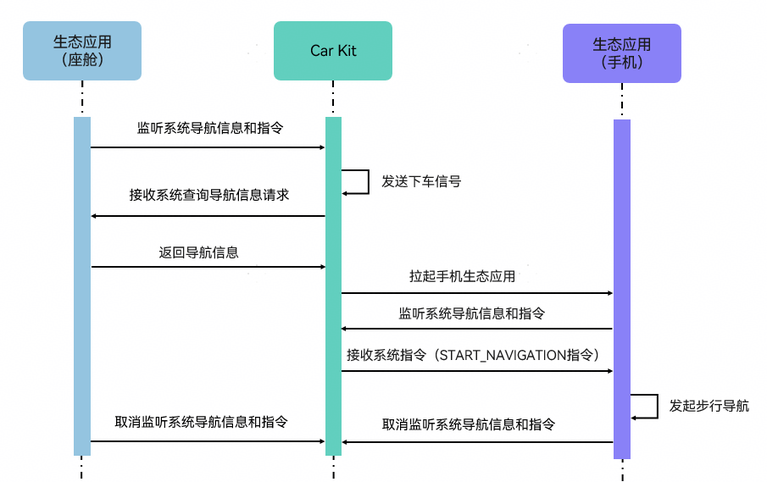 地图应用需要注册监听系统导航信息和指令,方便地图应用接收系统指令。用户下车后,系统会给地图应用发送START_NAVIGATION指令,地图应用在收到指令后即可开启步行导航任务。