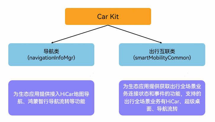 Car Kit(车服务)为开发者提供一套便捷接入出行服务的能力,开发者通过集成Car Kit,可以轻松实现在手机与鸿蒙智行车机之间无缝传递导航信息、通过超级桌面在鸿蒙智行车机上使用手机上的应用、通过HiCar在认证车机上使用手机上的应用等功能,为用户提供更加良好的出行体验。